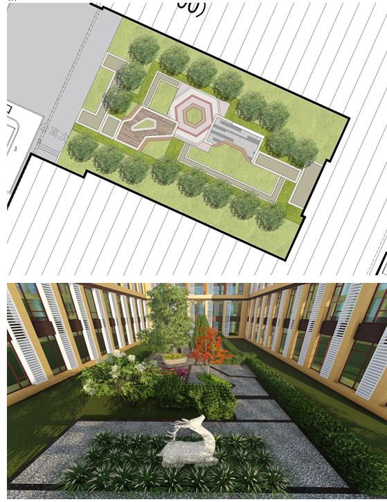 園區主要的改造區域分為兩部分,一部分是食堂公寓區域,另一部分是7300車間區域。景觀提升本著“以人為本”的原則,創造舒適宜人的可人環境,強調安全生產的重要性,同時最大限度的提高綠視率。設計結合現有已形成的平面布局,利用景觀元素加以串聯,集中體現廣場景觀空間,同時融入“大醫精誠,家國天下”的企業理念。在開敞空間與私密空間之間尋找結合點,使廣場既有滿足人民較大范圍的公共開敞流動區域,又有適合人民肚子休閑停留,具有私密性的小空間,強調細部處理多樣化。整體形成開放大氣、合理高效、精致韻味景觀風格。